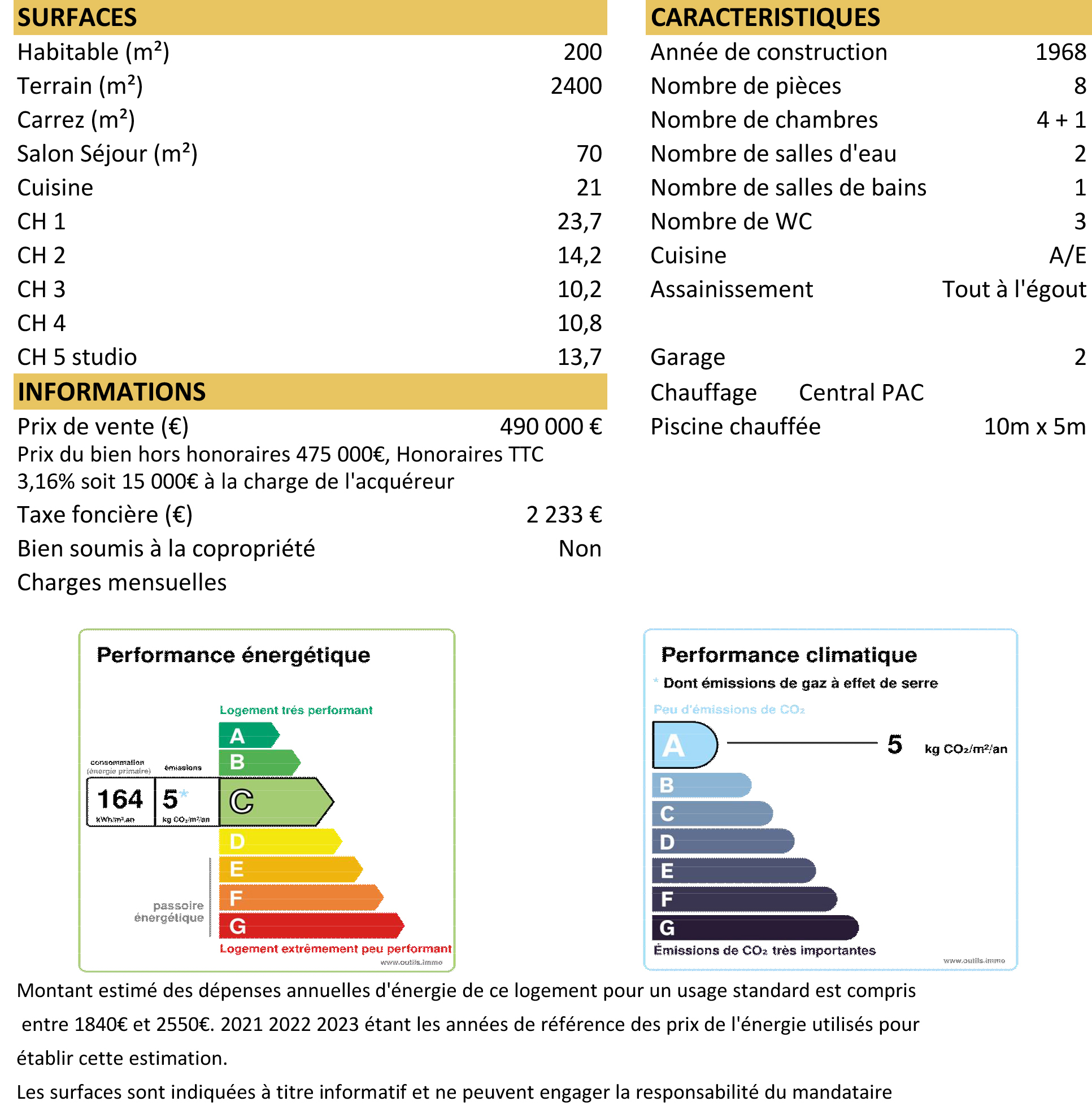 Montant estimé des dépenses d'énergie pour un usage standard entre 1840€ et 2550€ par an prix moyen des énergies indéxés au 01/01/2021/2022/2023