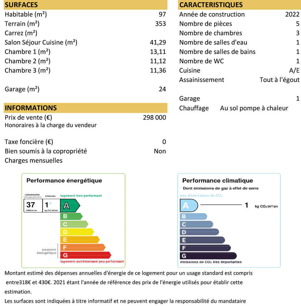 Prix du bien 298 000 € Honoraires à la charge du vendeur