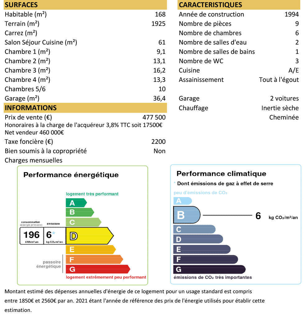 Prix du bien Hors honoraires 460 000 €, Honoraires TTC : 3.8% soit 17 500 €, Honoraires à la charge de l'acquéreur.