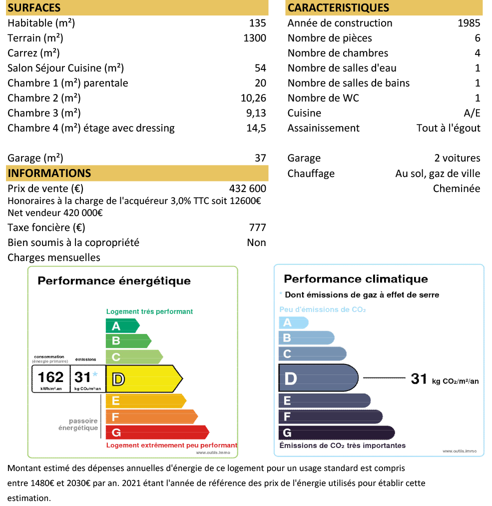 Prix du bien hors honoraires 420 000€, Honoraires TTC : 3,00% soit 12600 €, Honoraires à la charge de l'acquéreur