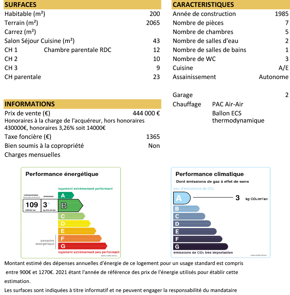 Prix du bien hors honoraires 430 000€, Honoraires TTC : 3,26% soit 14 000 € à la charge de l'acquéreur.