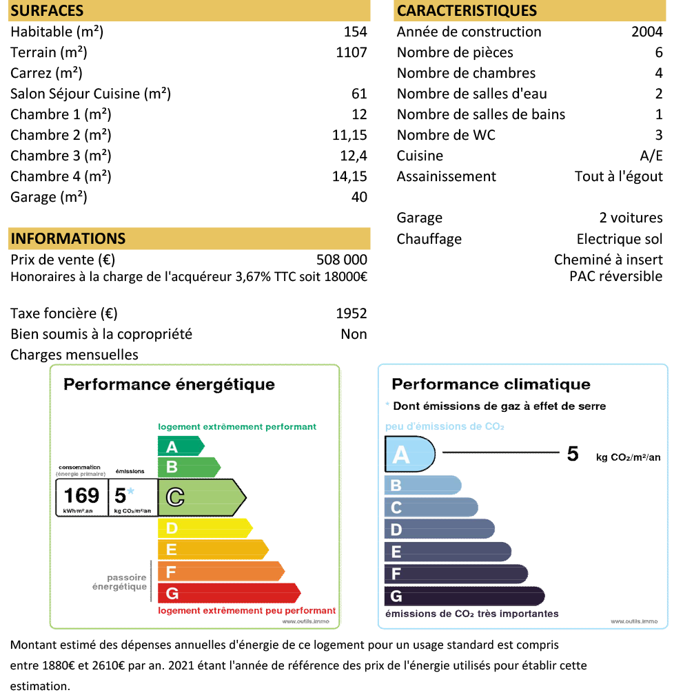 DPE C et GES A. Montant estimé des dépenses d'énergie pour un usage standard entre 1880 et 2610€ par an prix moyen des énergies indéxées en 2021 2022 2023.